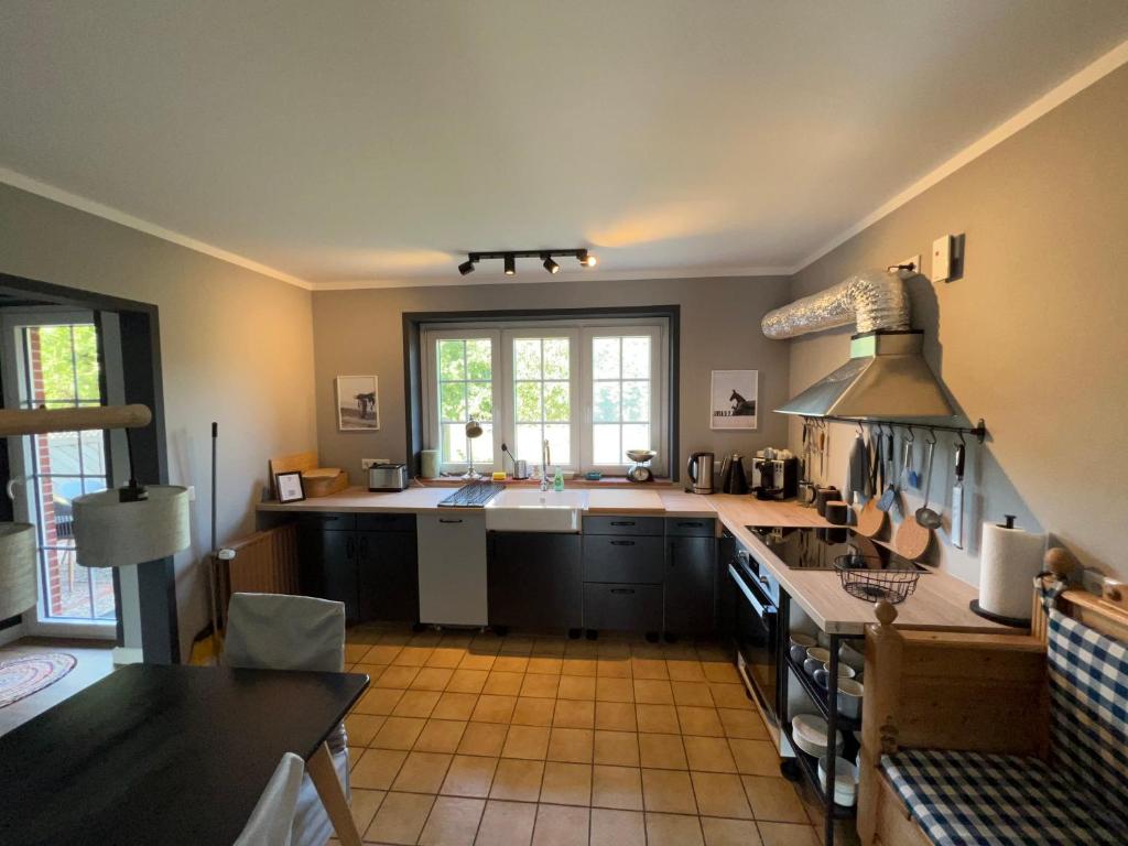 Die geräumige Küche verwöhnt Sie mit einem Induktionsherd, Dunstabzugshaube, Backofen, Geschirrspülmaschine, Kühlschrank mit Gefrierschrank und einem gemütlichen Essbereich.