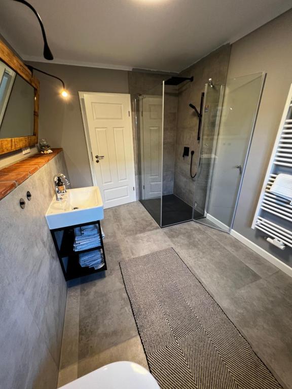 Das schöne Badezimmer mit der ebenerdigen Dusche runden das Bild ab.